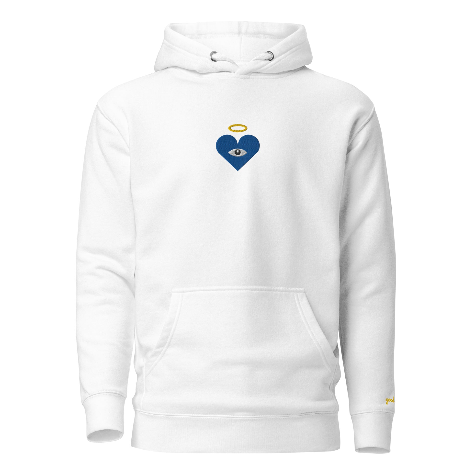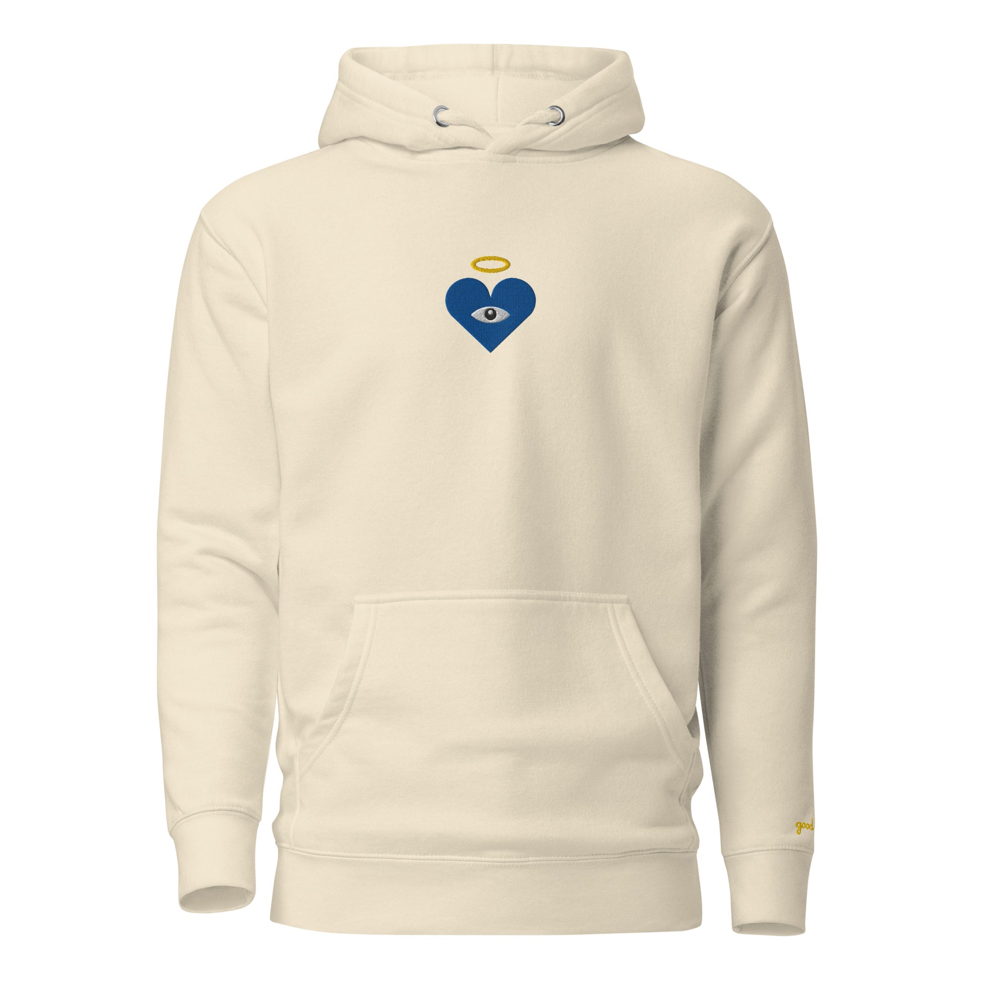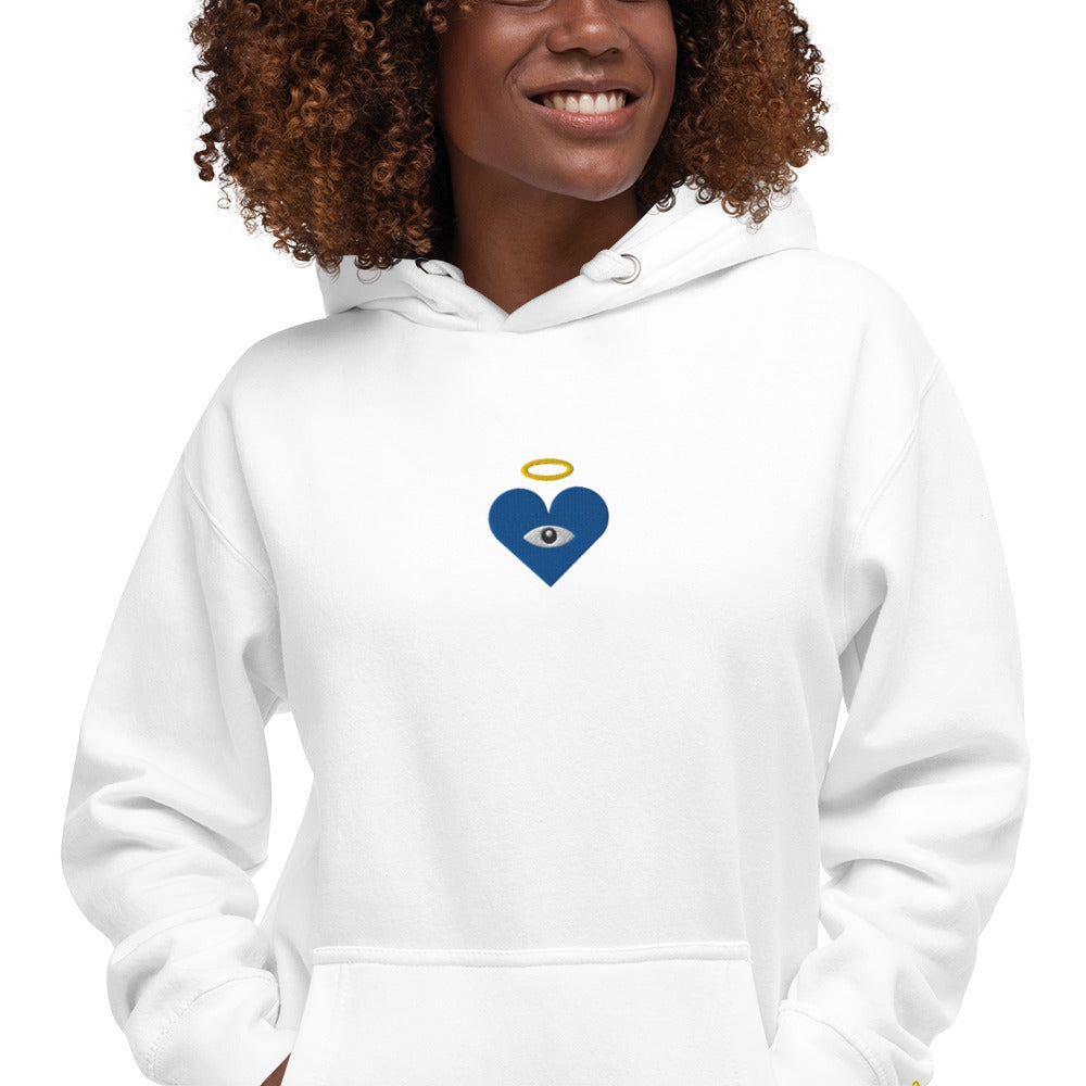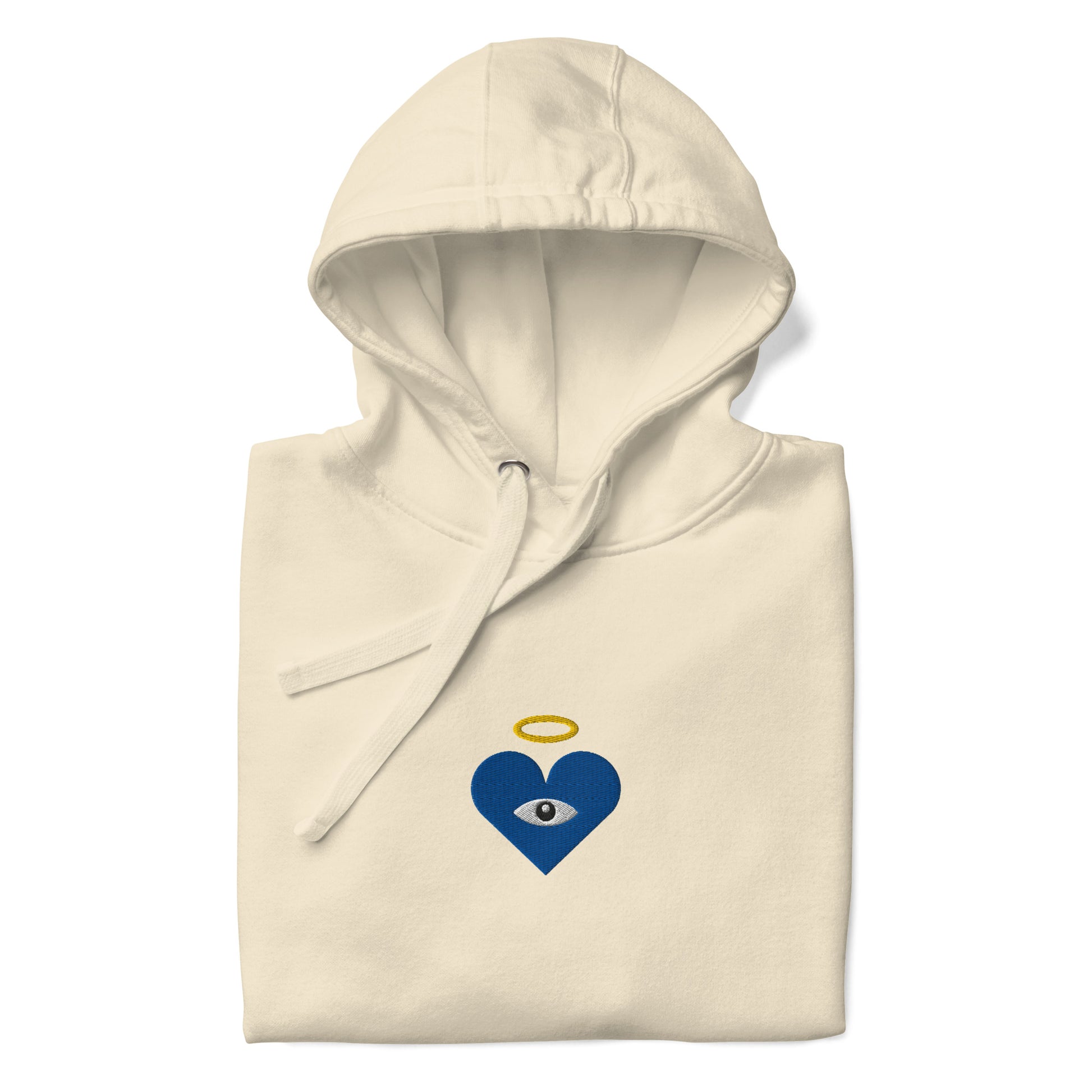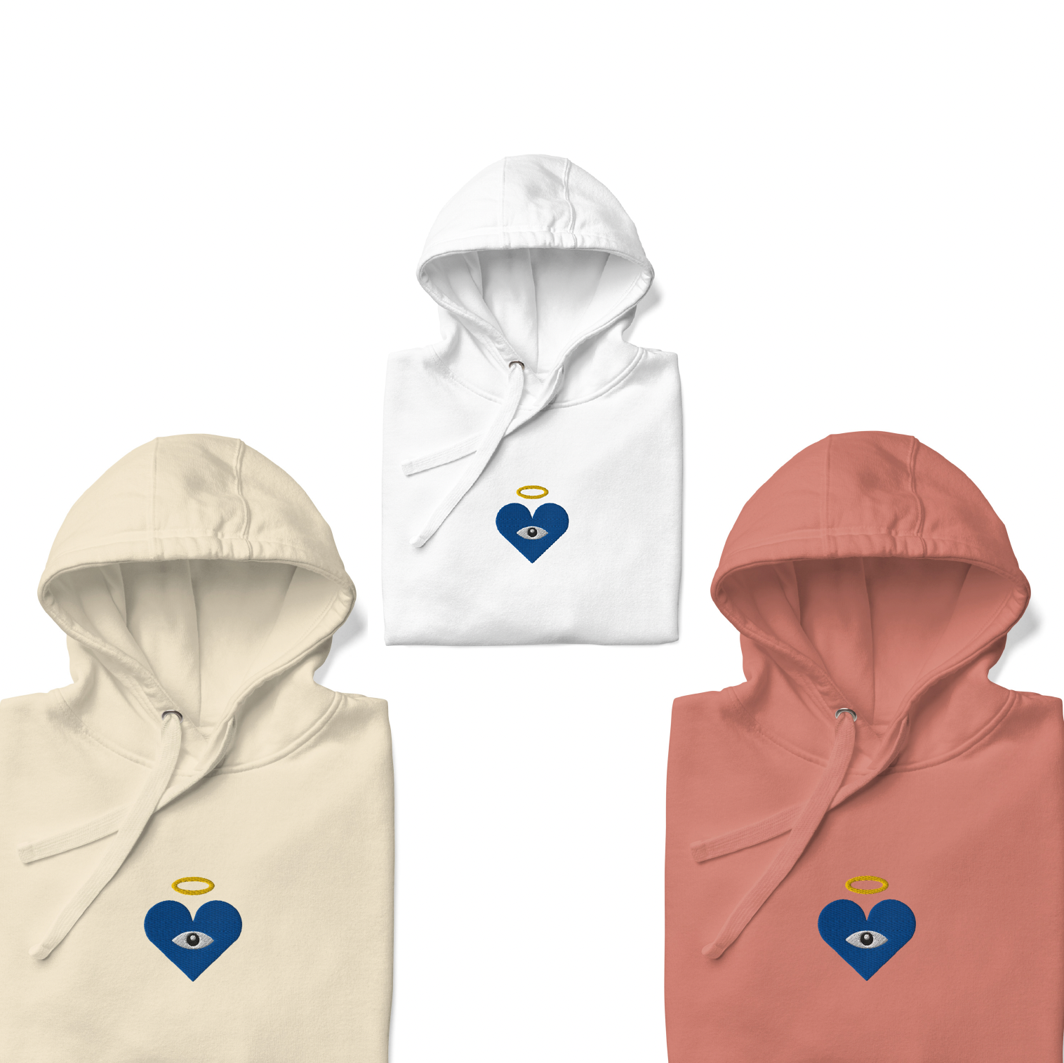 Step into effortless style with our Heart-Eye Embroidered Hoodie—a sleek, minimalist nod to divine connection and personal expression. Featuring the signature Blue Heart-Eye symbol embroidered on the center chest and "good chills" stitched discreetly on the wrist, this hoodie is designed to elevate your everyday look with a touch of spiritual artistry. Choose your favorite color pairing!