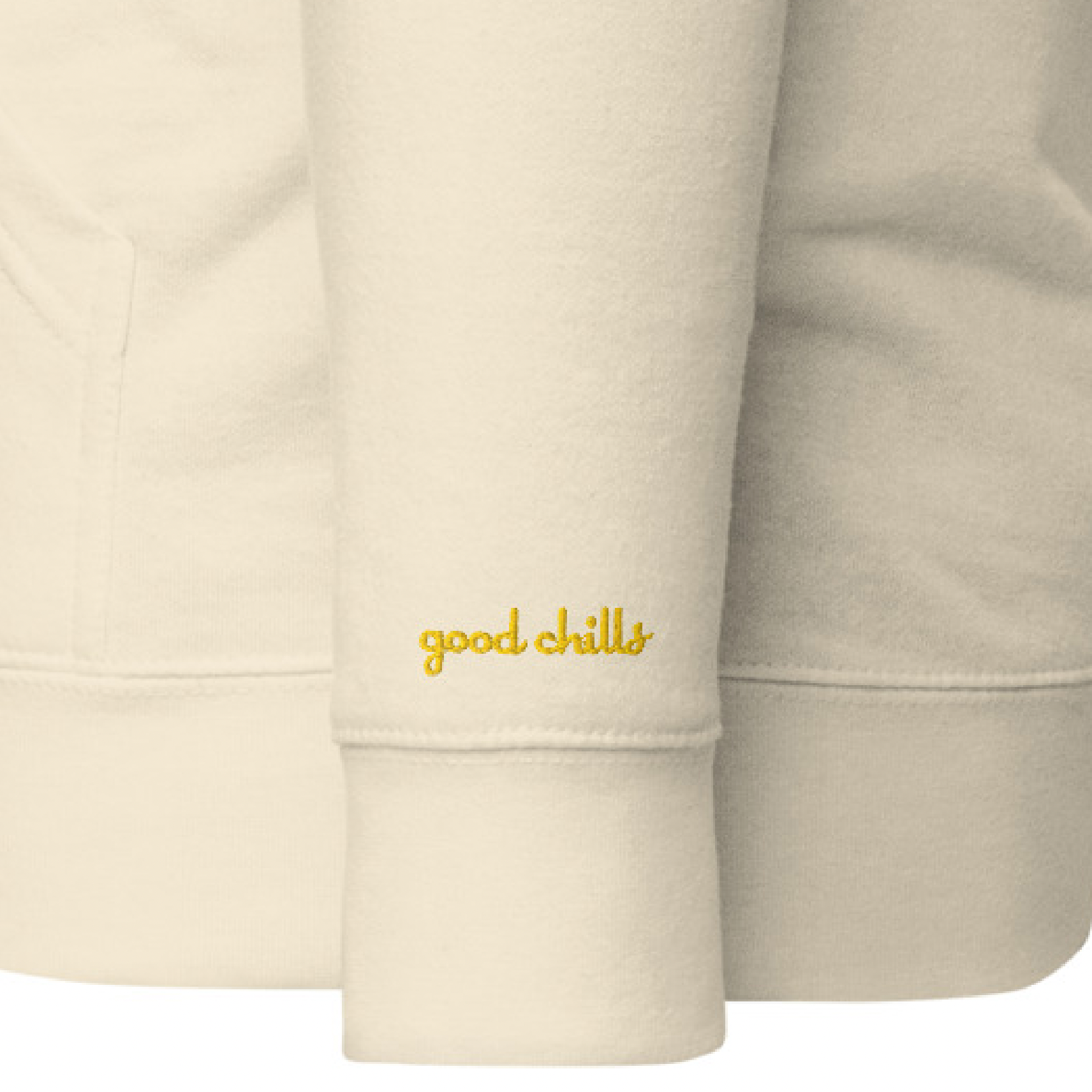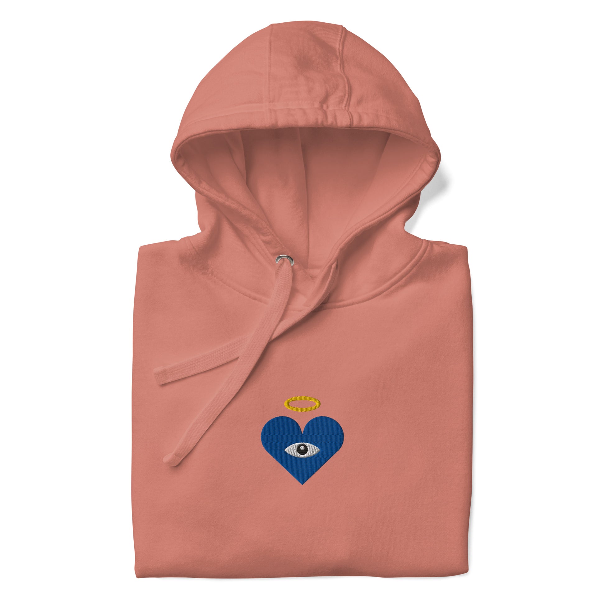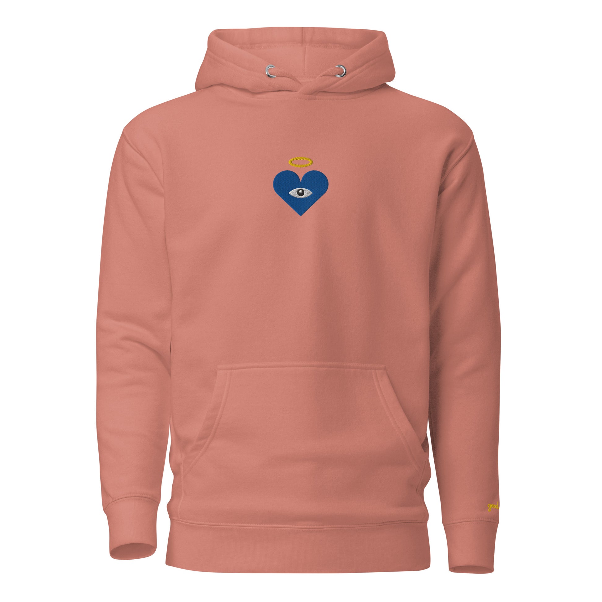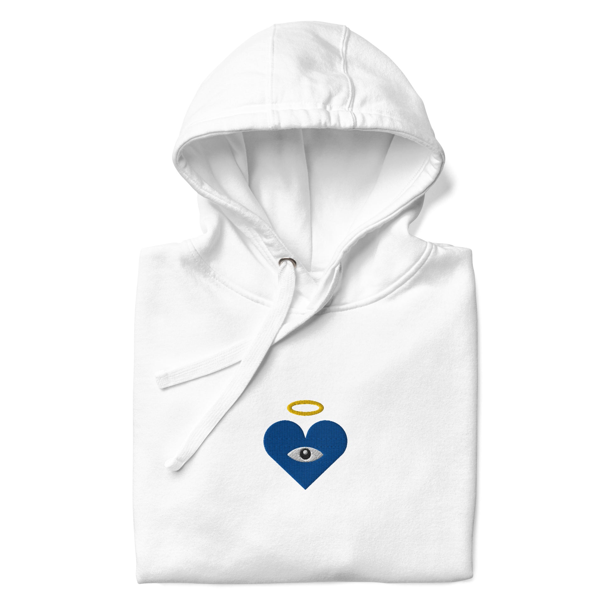 Step into effortless style with our Heart-Eye Embroidered Hoodie—a sleek, minimalist nod to divine connection and personal expression. Featuring the signature Blue Heart-Eye symbol embroidered on the center chest and "good chills" stitched discreetly on the wrist, this hoodie is designed to elevate your everyday look with a touch of spiritual artistry. Choose your favorite color pairing!