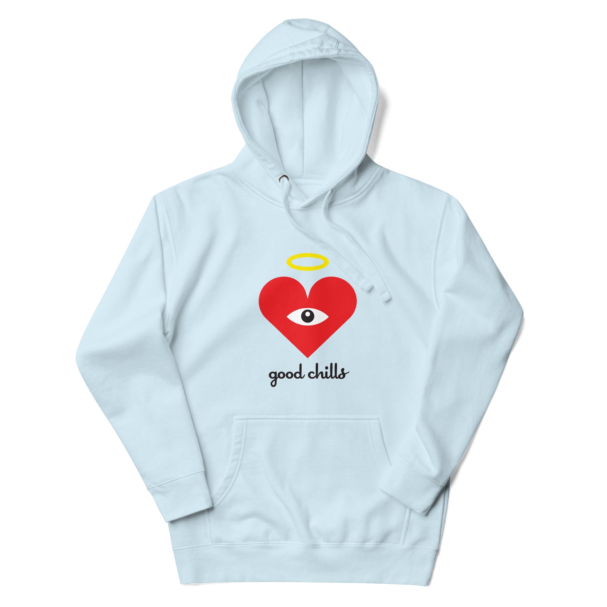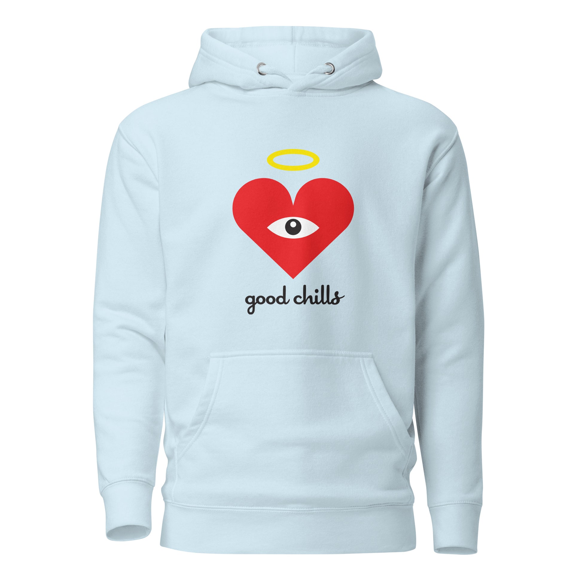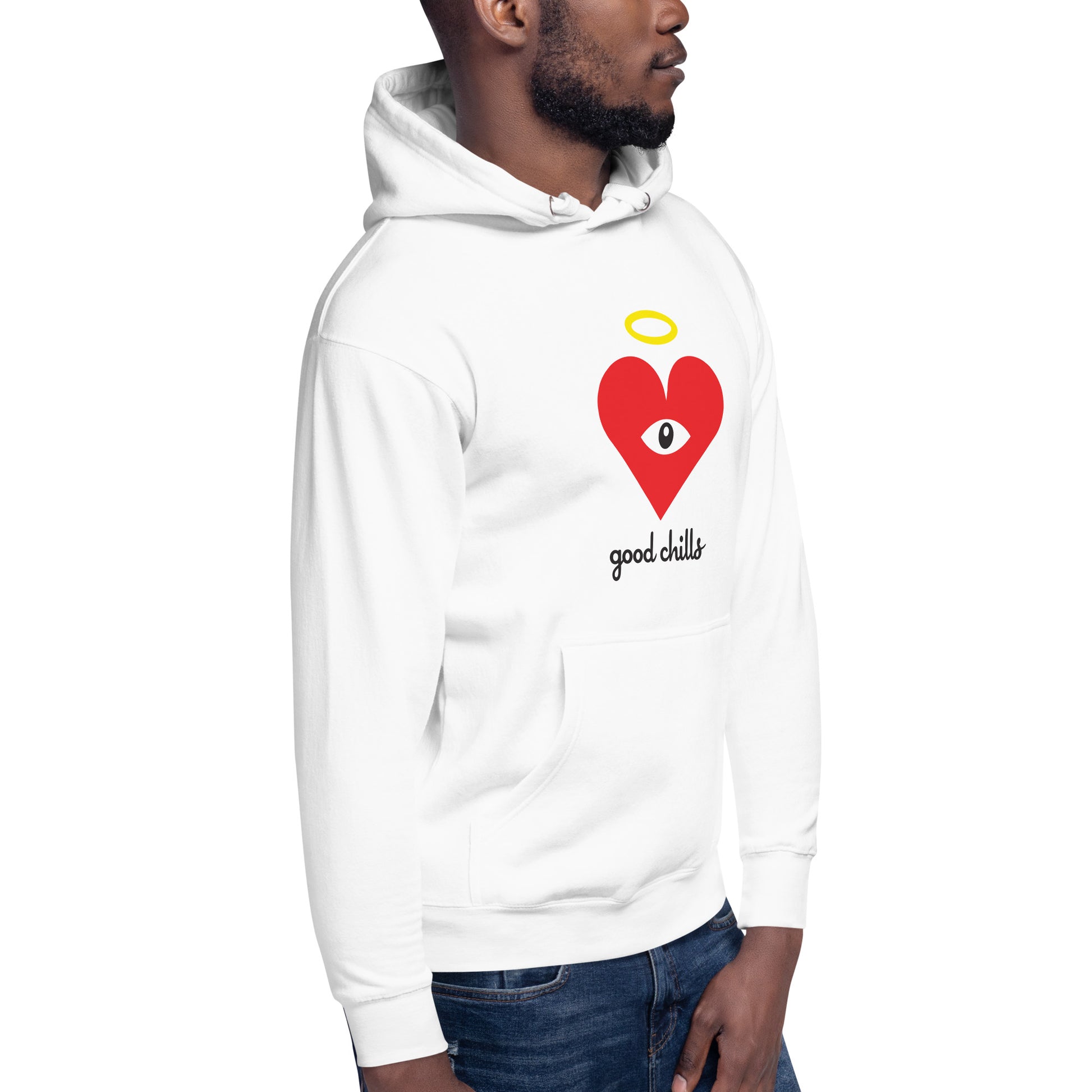 Stay cozy, stay chill. This "good chills" Red Heart-Eye Hoodie is all about comfort with a side of effortless cool. The haloed Heart-Eye brings just enough intrigue, while the sleek message reflects your signature style. Perfect for the person whose energy speaks before they do—this hoodie is your vibe in fabric form.