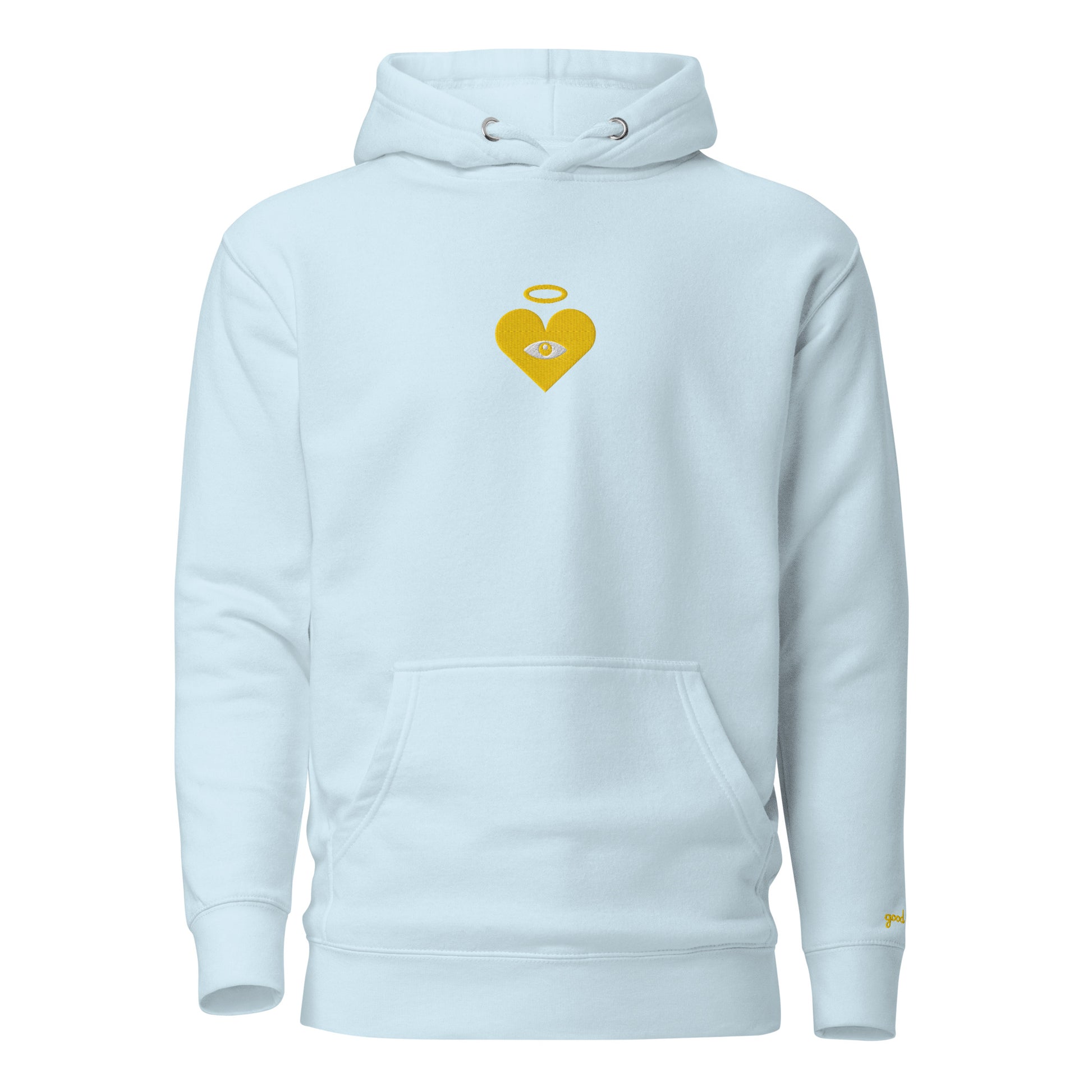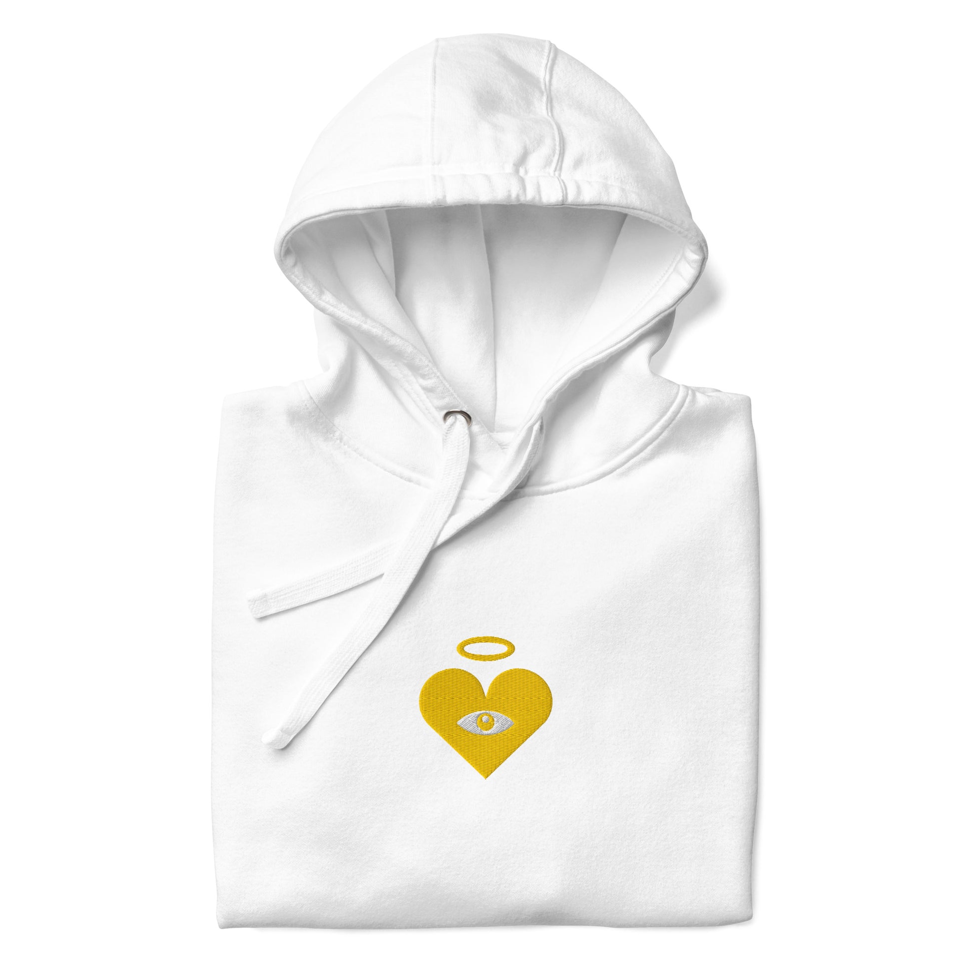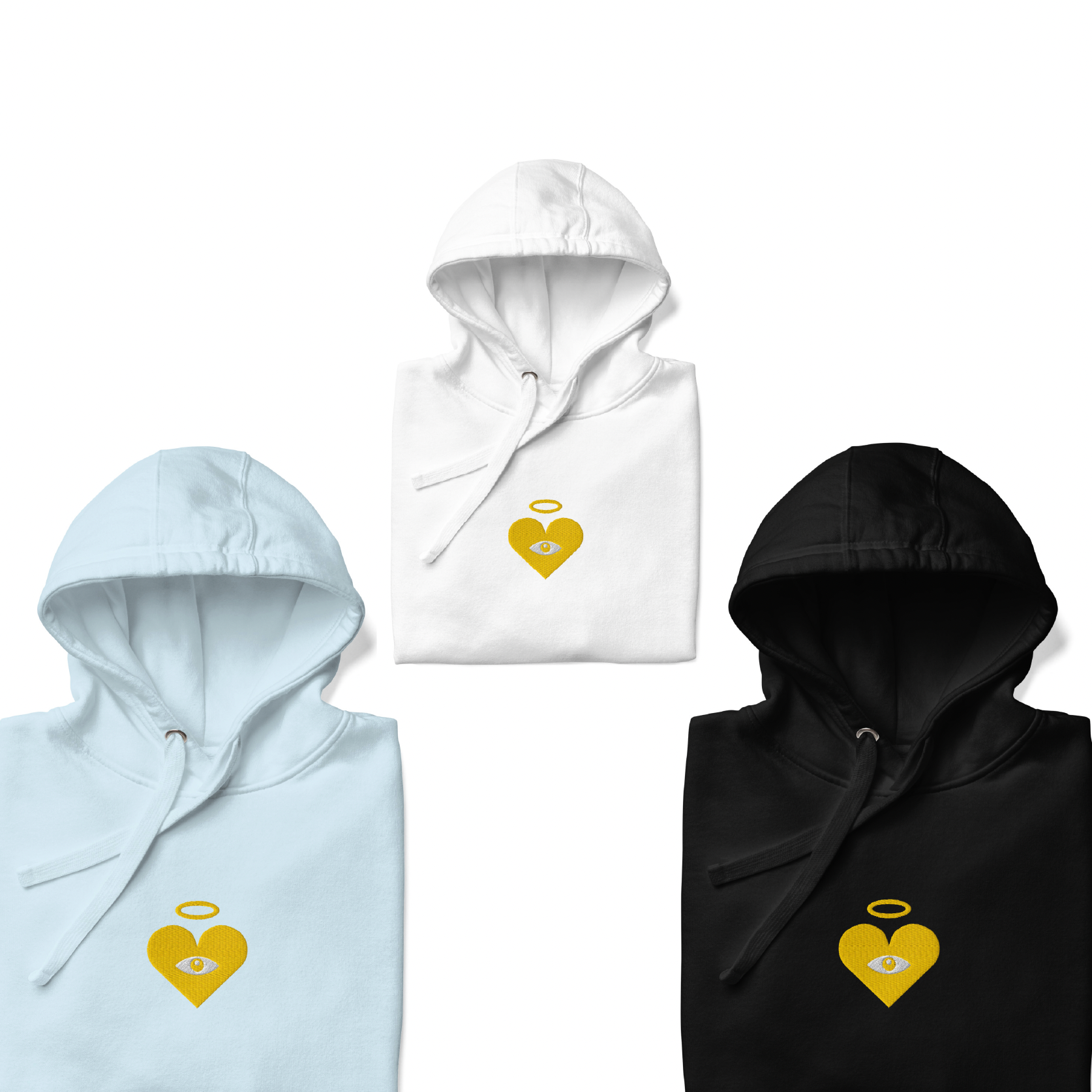 Step into effortless style with our Heart-Eye Embroidered Hoodie—a sleek, minimalist nod to divine connection and personal expression. Featuring the signature Monochrome Gold Heart-Eye symbol embroidered on the center chest and "good chills" stitched discreetly on the wrist, this hoodie is designed to elevate your everyday look with a touch of spiritual artistry.