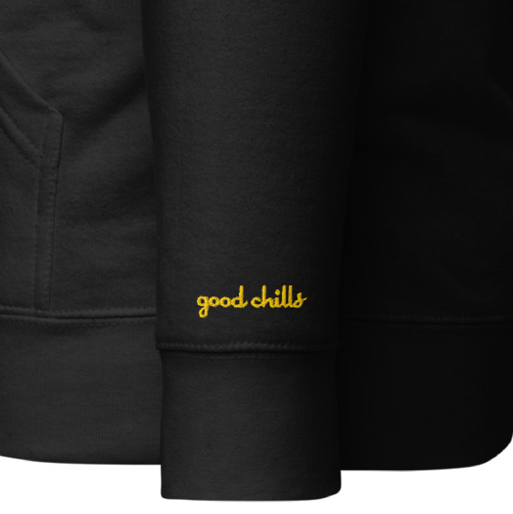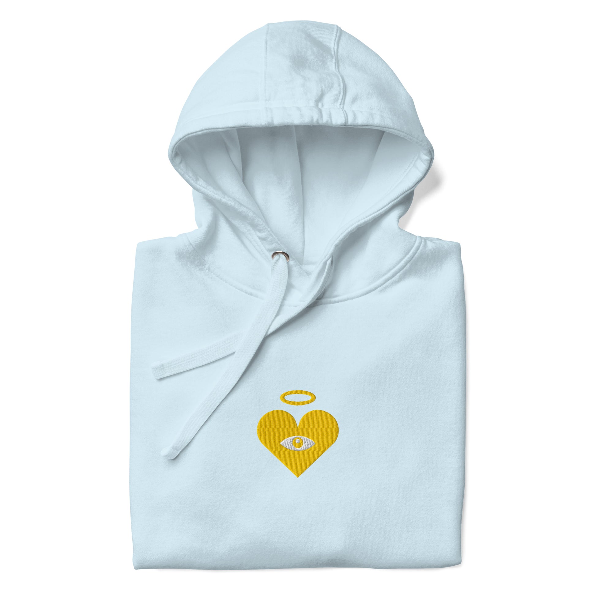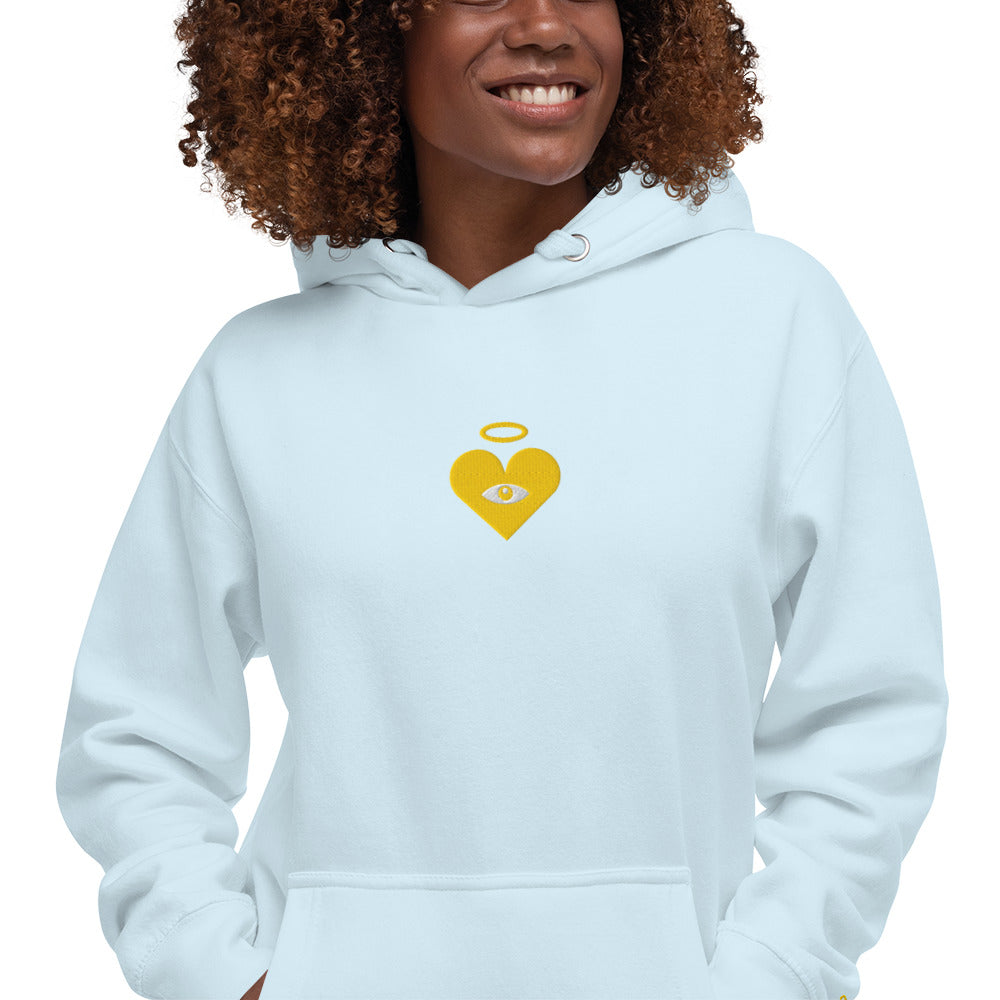 Step into effortless style with our Heart-Eye Embroidered Hoodie—a sleek, minimalist nod to divine connection and personal expression. Featuring the signature Monochrome Gold Heart-Eye symbol embroidered on the center chest and "good chills" stitched discreetly on the wrist, this hoodie is designed to elevate your everyday look with a touch of spiritual artistry.