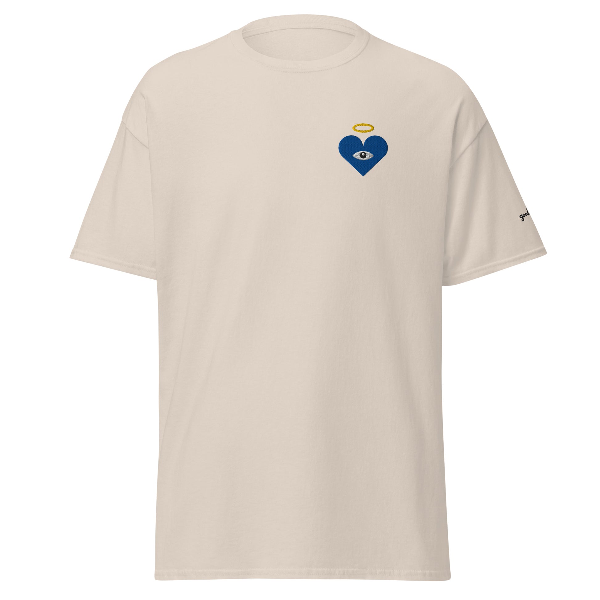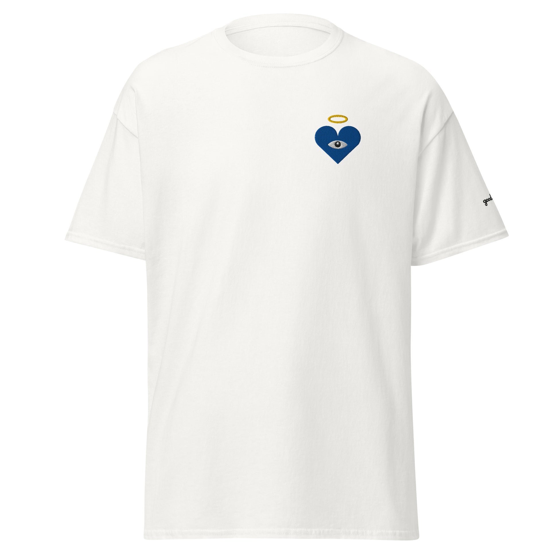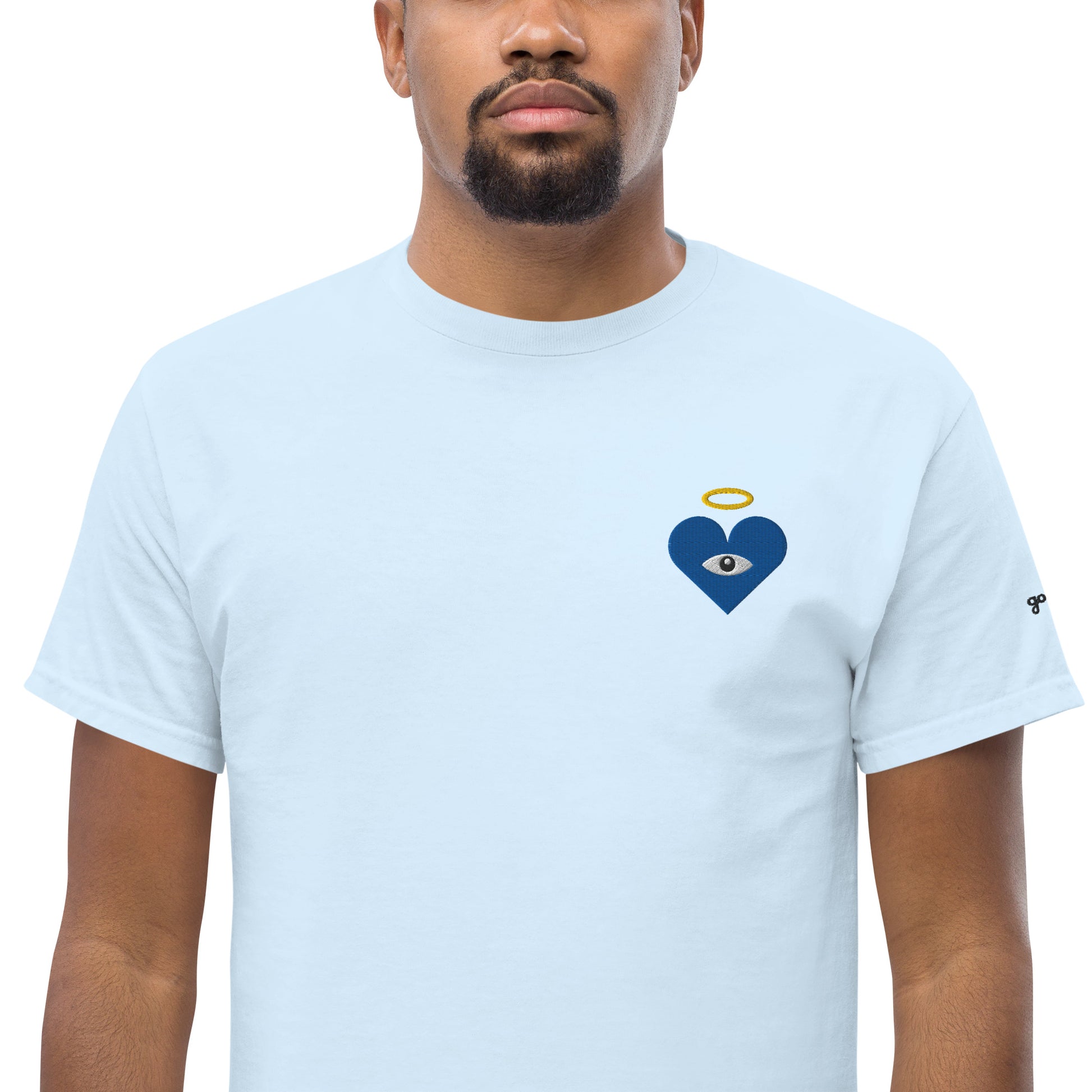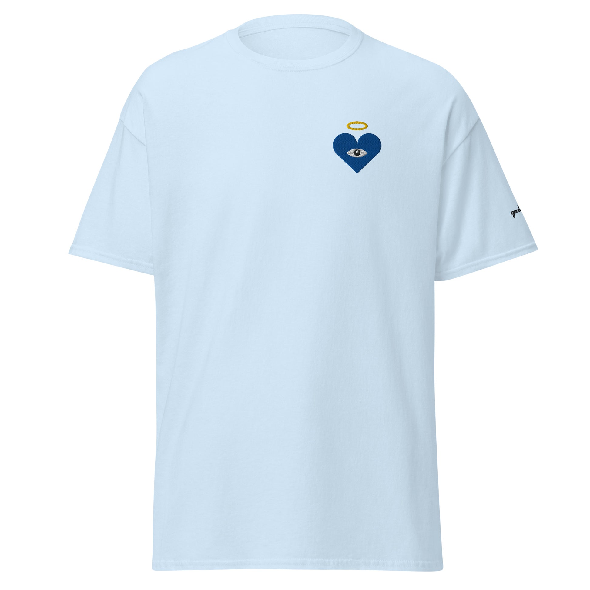 Guard your spirit in style with the Protect Your Heart! Embroidered Blue Heart-Eye Classic Tee. The embroidered Heart-Eye serves as a mystic symbol of protection and connection, inviting you to walk humbly, yet exalted. Subtle yet striking, a badge of peace and honor, “good chills” written on the left sleeve. This shirt is for those who like subtle statements and protect what matters most.