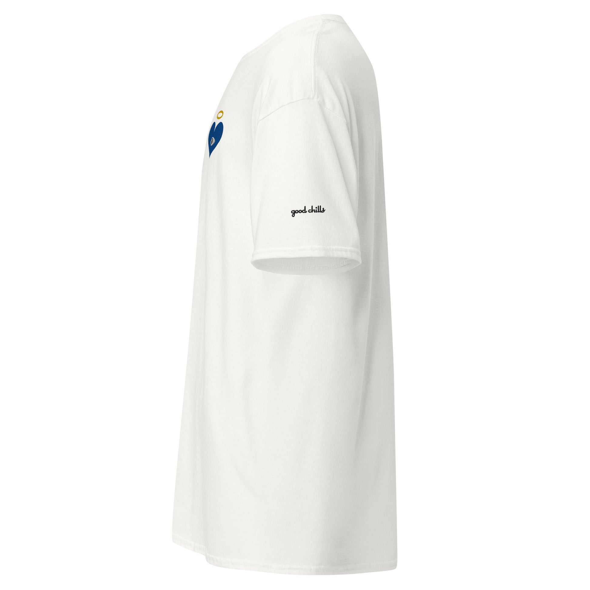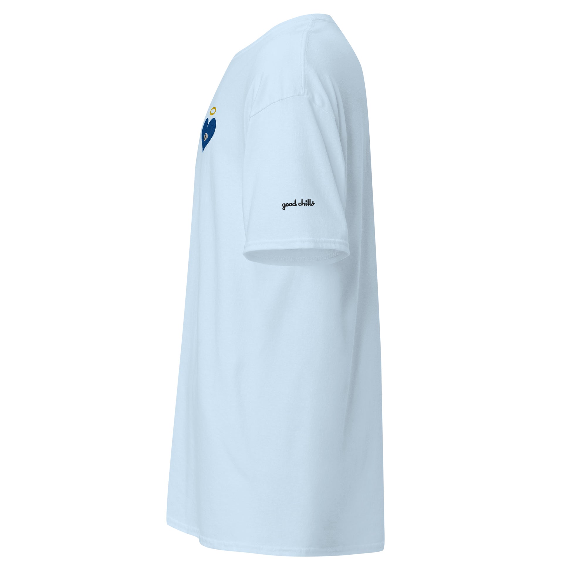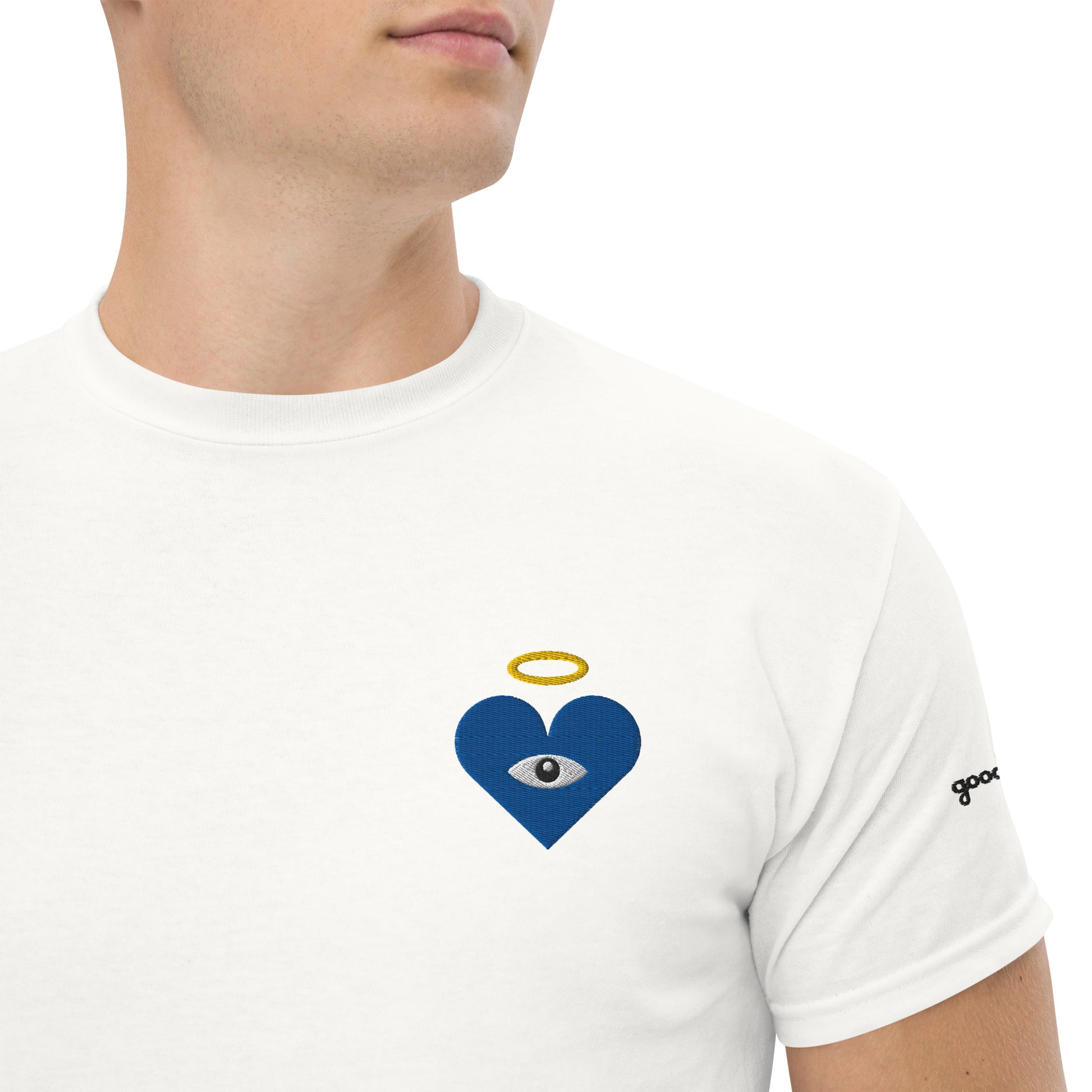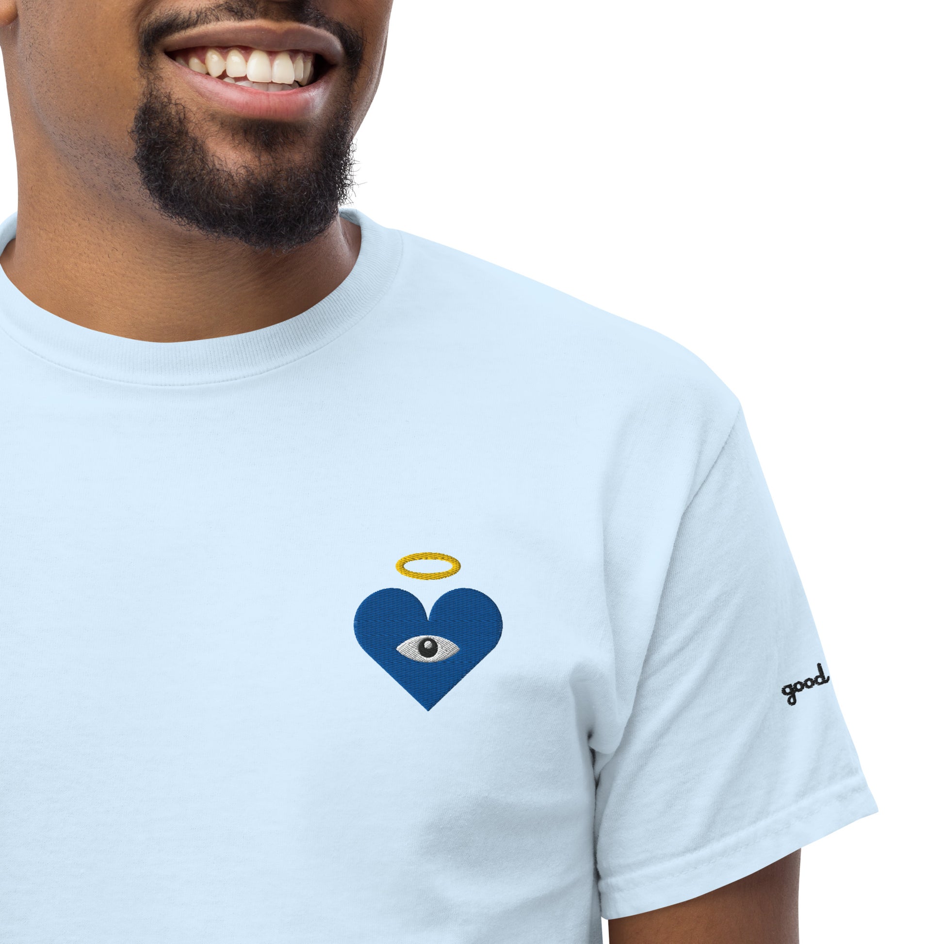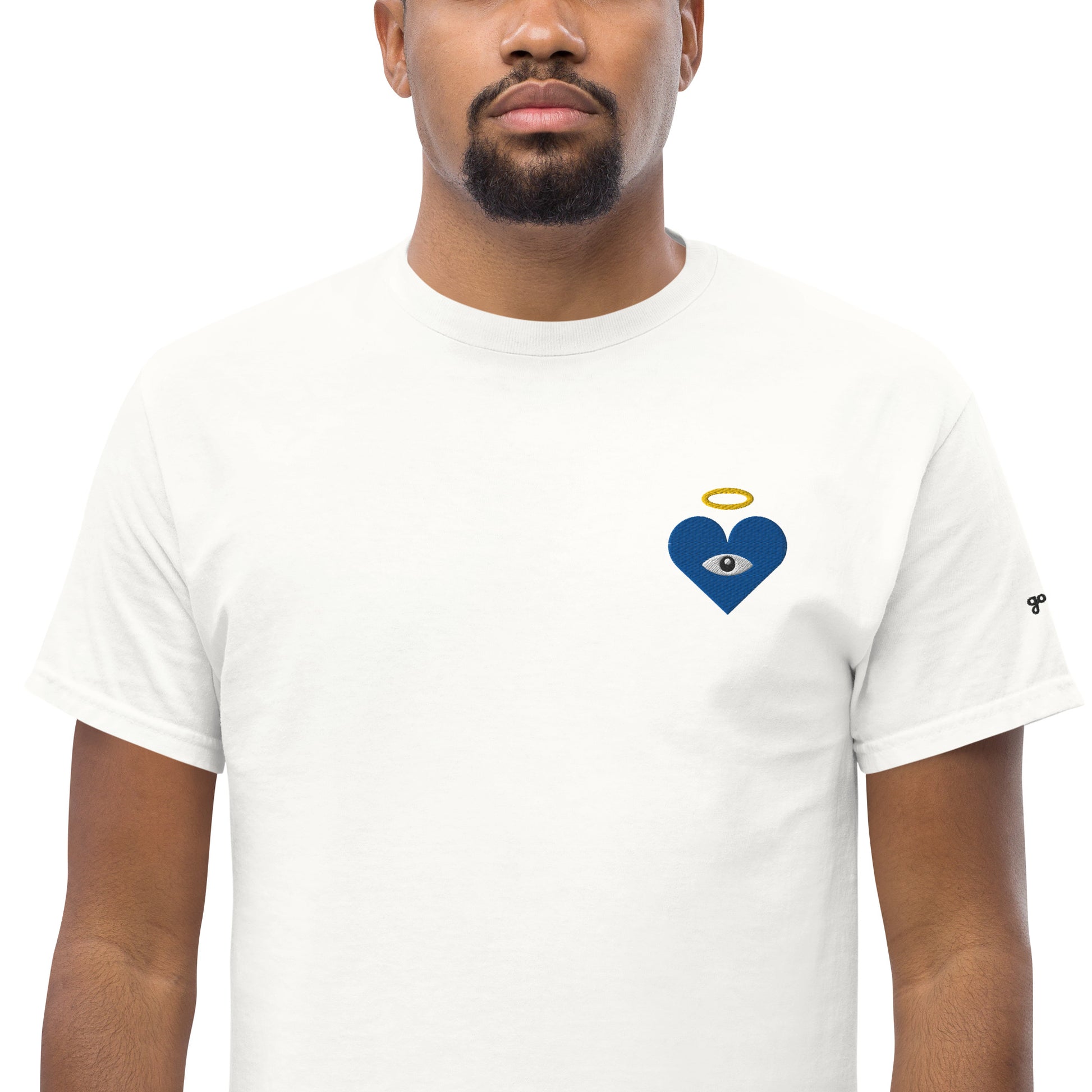 Guard your spirit in style with the Protect Your Heart! Embroidered Blue Heart-Eye Classic Tee. The embroidered Heart-Eye serves as a mystic symbol of protection and connection, inviting you to walk humbly, yet exalted. Subtle yet striking, a badge of peace and honor, “good chills” written on the left sleeve. This shirt is for those who like subtle statements and protect what matters most.