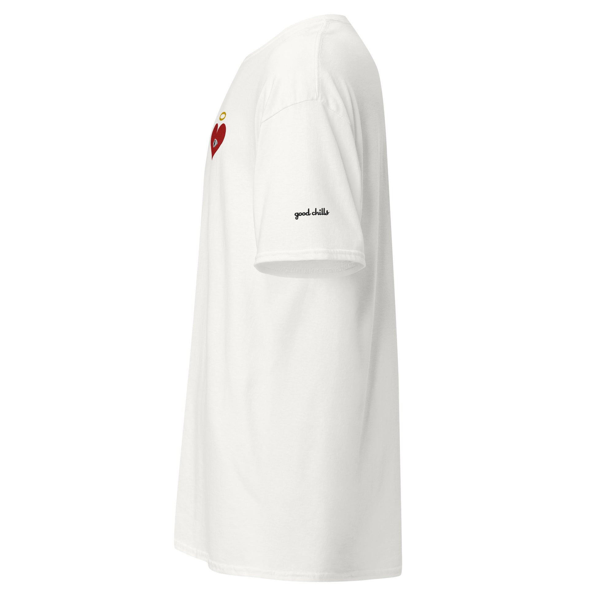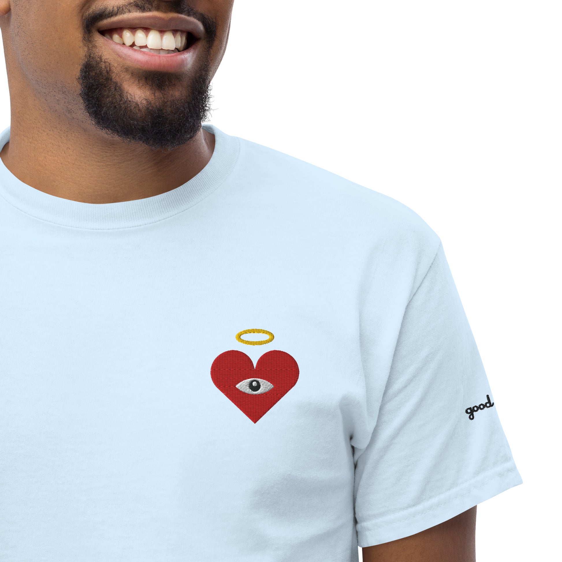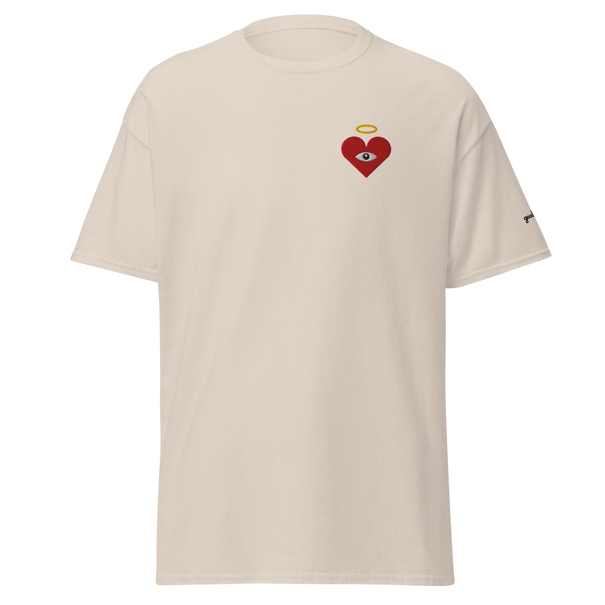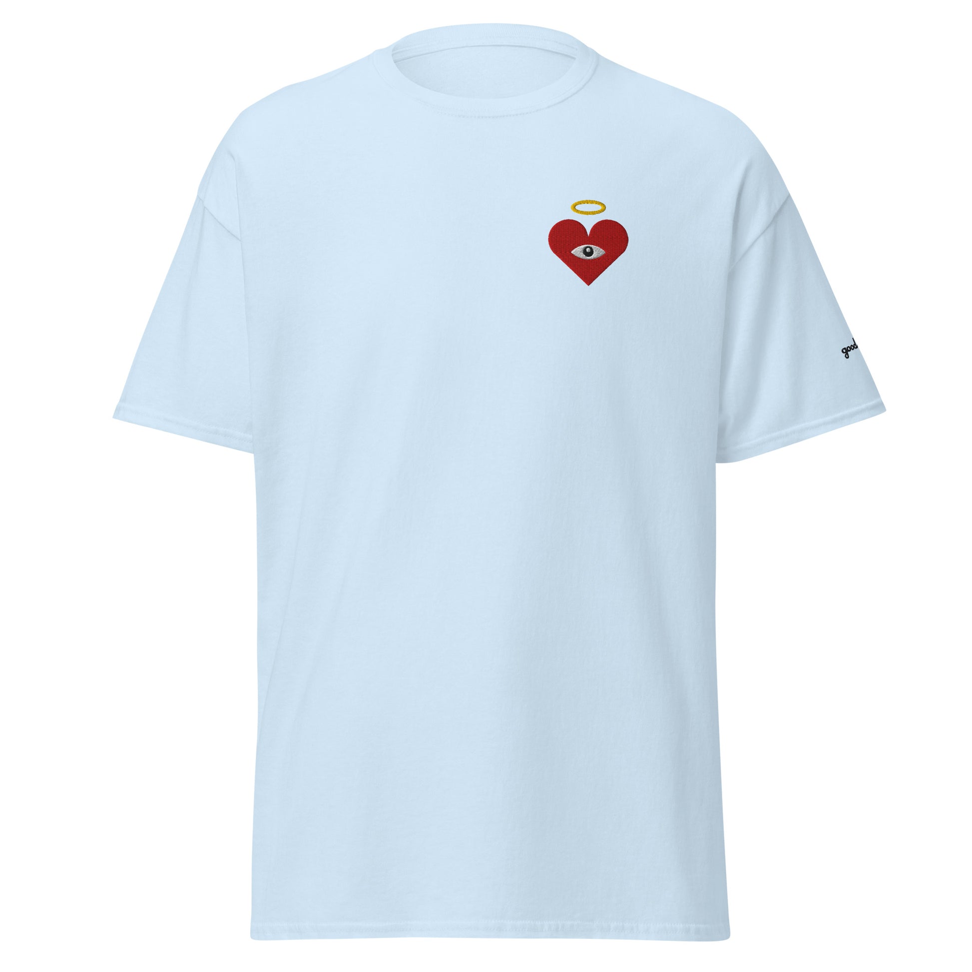Guard your spirit in style with the Protect Your Heart! Embroidered Red Heart-Eye Classic Tee. The embroidered Heart-Eye serves as a mystic symbol of protection and connection, inviting you to walk humbly, yet exalted. Subtle, yet striking, a badge of peace and honor, “good chills” additionally embroidered on the left sleeve. This shirt is for those who like subtle statements and protect what matters most.